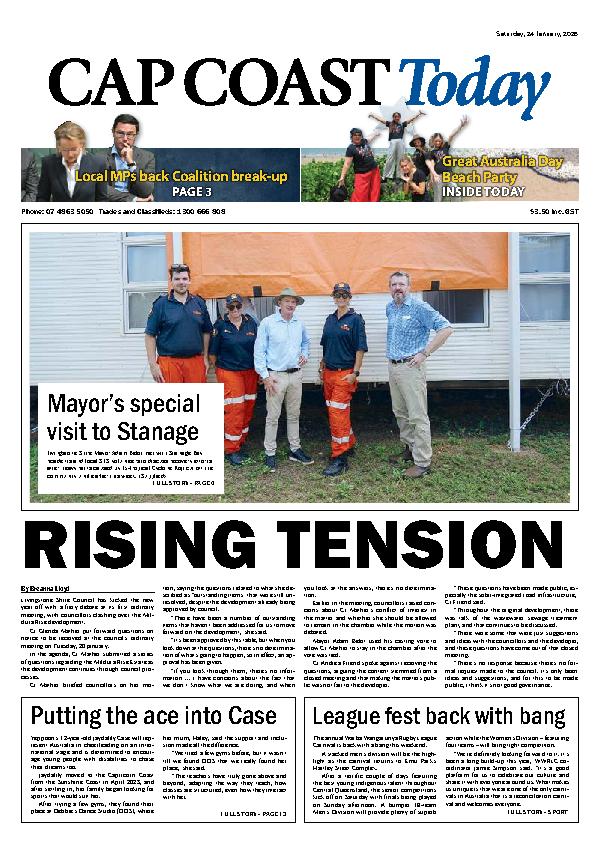 Cap Coast Today – 24th January 2026 Subscribe or Login to see the rest of the content. Username Password * Remember Me Forgot Password News Insights into mental strength at gala dinner 24/01/2026 A "who's who of Central Queensland" will make their own luck at Titan IND's gala dinner on Friday, 13 February, with all the... Stanage Bay connected again 24/01/2026 Livingstone Shire Mayor Adam Belot spent a busy Sunday in Stanage Bay, assisting the flood-affected community and delivering a “much-needed” supply of Krispy Kreme... Motor Boat Club ready to begin clean-up 24/01/2026 Fitzroy Motor Boat Club members will soon begin their clean-up once the flood water recedes. While the river height fell short of the predicted 7.5...