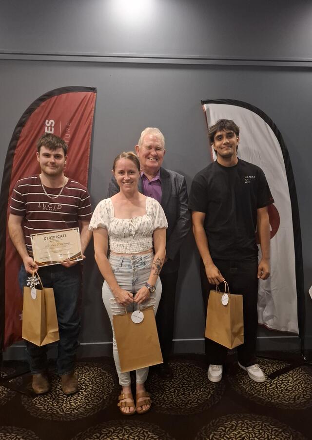 Apprentices and Trainees Qld Apprentice of The Year finalists: Jordan Downing – Ashton Engineering (winner), Danielle Barnes - O’Ryan Signs and Designs, Lockwood Parsons – Ashton Engineering. Also pictured is ATQLD chairman David Grenfell. (Supplied)