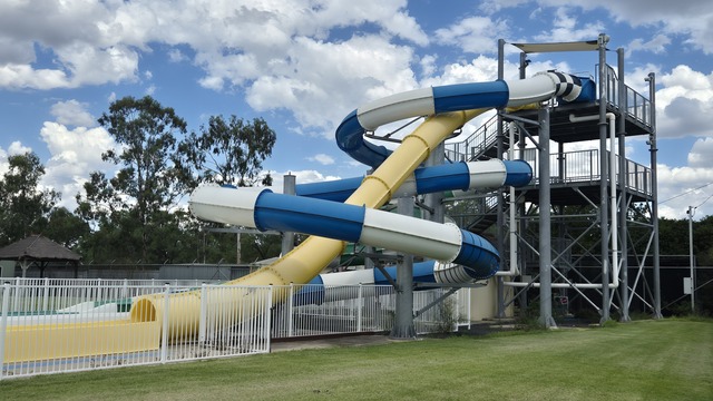 The Emerald Aquatic Centre's three water slides are accessed from five and eight-metre platforms. Two may possibly open later this year. (File)