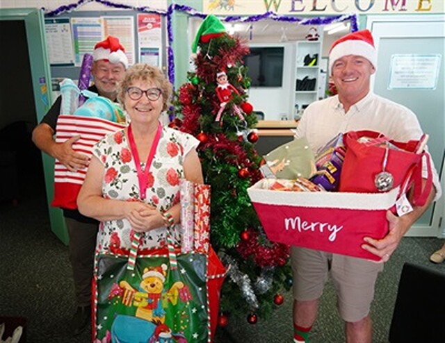 Councillor Rodes Watson, community centre volunteer Christina and Mayor Adam Belot at the Yeppoon Community Centre for the Mayor’s Christmas Giving Tree Appeal.