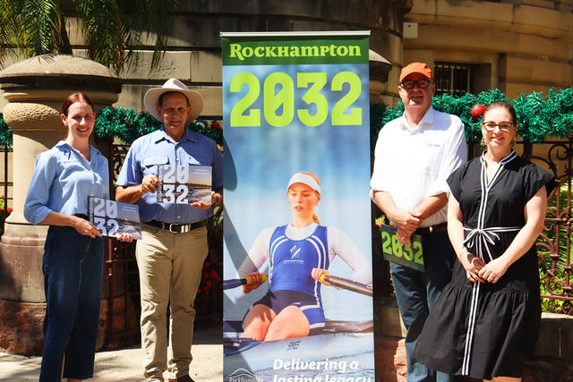 Rockhampton Fitzroy Rowing Club president Sarah Black, Rockhampton Region Mayor Tony Williams, Beef Australia chief executive officer Simon Williams and Advance Rockhampton tourism coordinator Lauren Law launch Rockhampton 2032. (Matthew Pearce: 522477)