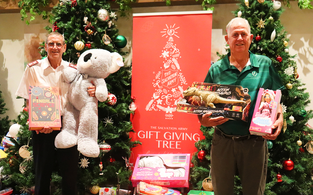 Major Paul Morrice from the Salvation Army Rockhampton and Frenchville Sports Club chairman Graeme Brady with gifts from the Frenchville Sports Club's Gift Giving Tree initiative. (Matthew Pearce: 524143)