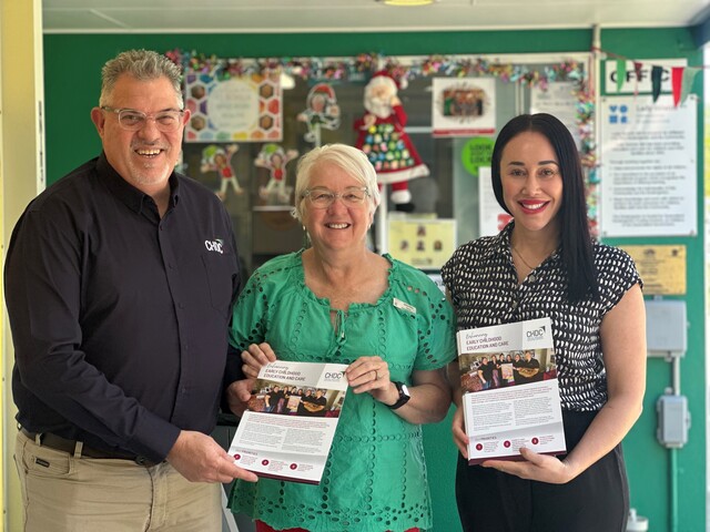 CHDC chief executive Peter Dowling and Deb Barns (right) shared the summary of the EECEC findings with Borilla Community Kindergarten's Jenny Finlay, a key contributor to the research. (Image: CHDC)