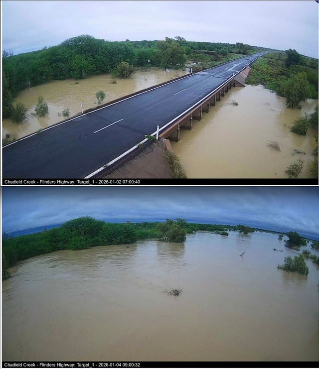 It is important for councils to have accurate, timely information to work with State and Federal agencies and keep their communities safe. Recent webcam timelapse of Chadield Creek on the Flinders Highway in Northwest Queensland. (Higgins Storm Chasing/Facebook)