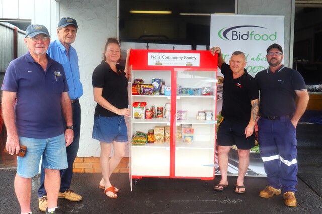 Paul Clare and John Elliott from the Fitzroy River Men's Shed help Michele, Tony and Darren Waine unveil the new community pantry at Mumma's Fish 'n' Chips. (Matthew Pearce: 528244)