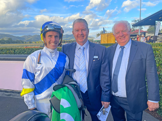 Rockhampton Jockey Club chief executive officer David Aldred and chairman Rob Carr, pictured with jockey Raul Silvera Olivera. The RJC has extended Aldred's tenure until the end of the decade. (Cherry and Jun Photography)