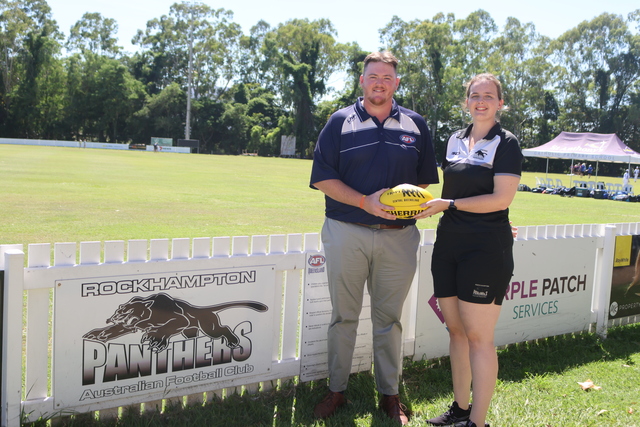 AFL Capricornia competition manager Jourdan Novak and Rockhampton Panthers senior vice-president Kiralea Walsh were all smiles after the announcement of the 2026 Festival of Footy. (Liam Emerton)