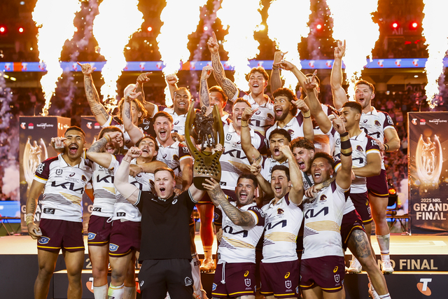 Central Queenslanders Ben Hunt and Kobe Hetherington celebrated with their Brisbane Broncos teammates after lifting the NRL premiership cup in October. (AAP Image/Mark Evans)
